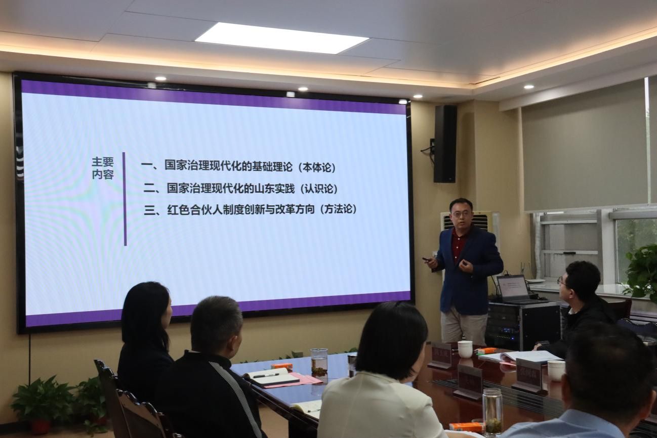 随后,赵金旭教授做《从国家治理现代化视角审视红色合伙人制度》的主题报告。从国家治理现代化的基础理论、国家治理现代化的山东实践、红色合伙人制度创新与改革方向三个方面,深入剖析红色合伙人信用治理对提升基层治理效能的重要意义,为新城街道进一步完善治理体系提供了高站位、专业化的理论指引。
