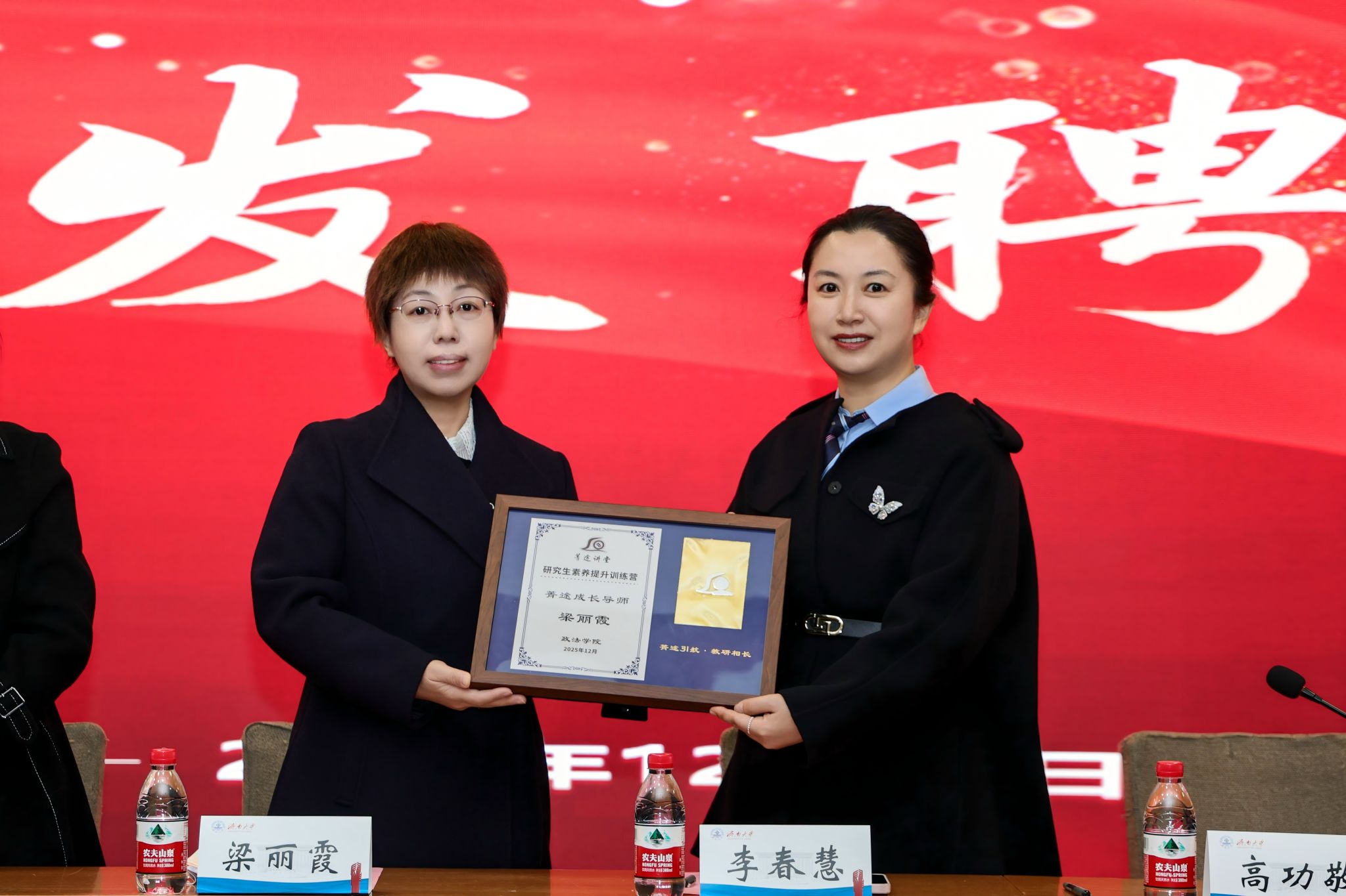 党委书记李春慧为山东省优秀研究生导师梁丽霞教授颁发“菁途成长导师”聘书,正式聘任其为“菁途讲堂”首批领航导师。