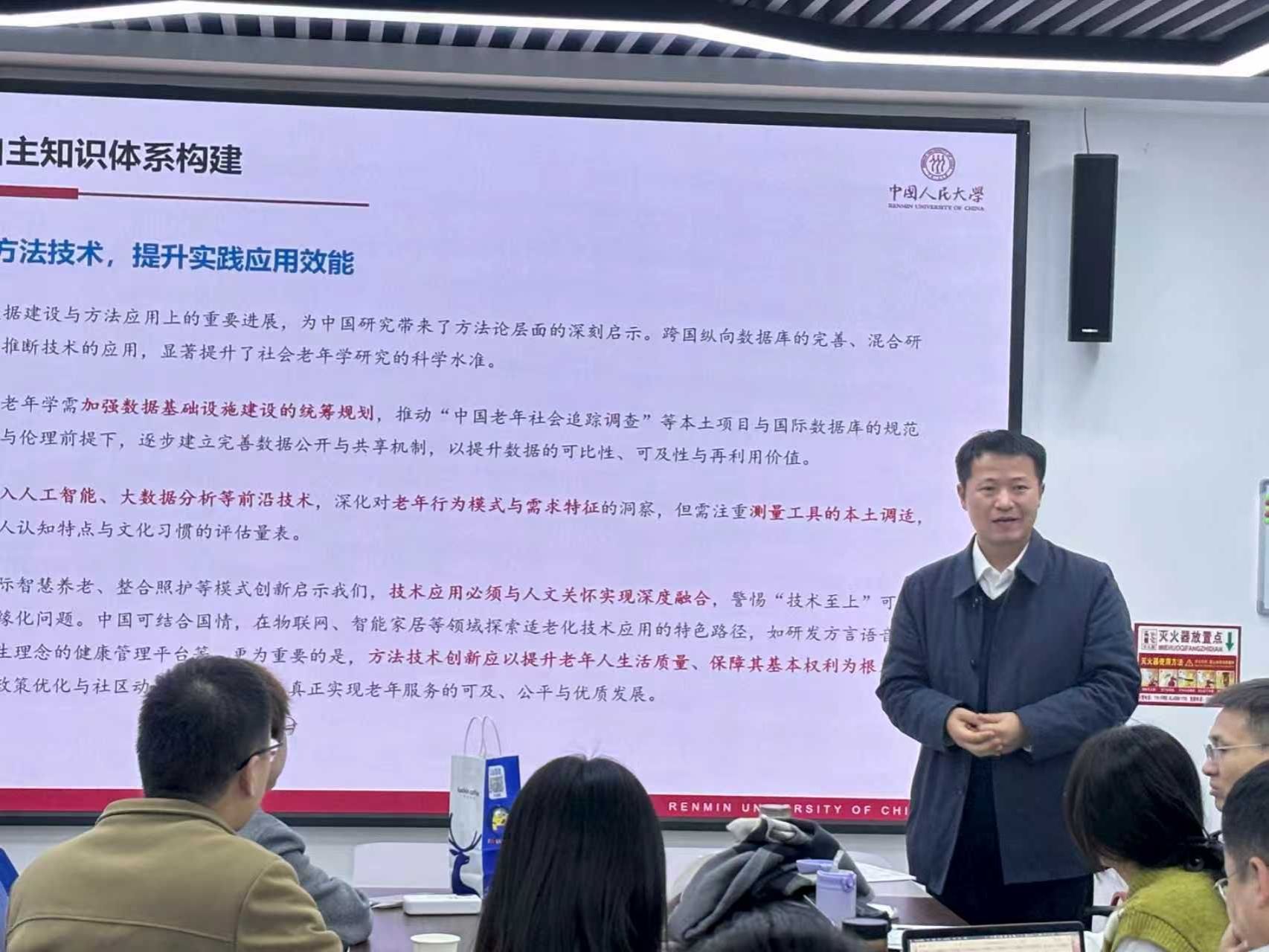 杜鹏教授首先以清晰的学术脉络,系统梳理了国际老年学从早期老年医学单一维度,向当代全球视野下跨学科融合发展的演进历程。基于对48种SSCI老年学期刊的深度分析,精准提炼出当前国际老年学研究的十大前沿热点领域,全面覆盖老年人口动态、老年健康保障、老年照护服务体系、老年家庭关系、老年数字融入、银发经济发展、老年友好环境建设、老年社会工作实践、老年社会治理创新等核心议题,呈现出一幅立体的国际老龄研究知识图谱。随后,杜鹏教授围绕研究范式革新、理论体系建构、数据方法优化与技术应用融合四大核心要素对学科创新发展进行了深入阐释,着重强调了跨国比较研究、生命周期分析视角及大数据技术应用对老年学学科发展的关键推动作用,为学科前沿探索提供了重要指引。针对中国老龄研究的本土化发展,杜教授结合国家积极应对人口老龄化战略部署与实践探索,从理论概念的本土重构、国际比较视野的拓展延伸、传统敬老文化的现代转化、研究技术方法的创新融合四个维度,明确了中国老年学学科高质量发展的路径方向,提出要构建立足中国实践、破解中国问题、彰显中国特色的老龄自主知识体系,为国家老龄事业发展提供坚实学术支撑。