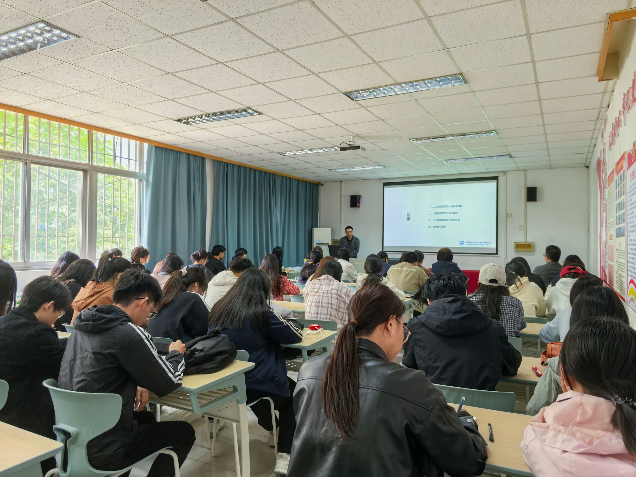 黄种滨老师重点讲述了人工智能时代的社会科学研究、大数据研究的方法论基础以及人工智能如何赋能社会科学研究。黄老师指出推动人工智能发展是国家战略,在公共管理相关议题的研究中,人工智能不仅能够提高研究和写作效率,并且能够激发创造力。但是,人工智能在赋能科学研究室,也存在风险与挑战,如技术依赖风险、准确性和可靠性问题、隐私与安全问题等。黄种滨老师以实践案例向同学们展示了人工智能在社会政策分析中的应用。黄种滨老师的讲座深入浅出且富有启发性,他循循善诱引导同学们思考人工智能应用于社会科学研究领域方式的创新性,拓展同学们的思路,打开学术视野。在互动交流环节,同学们结合课堂学习疑点、科研实操难点等问题深入思考,积极举手发言、大胆交流探讨,黄老师逐一细致解答,现场学术氛围浓厚。