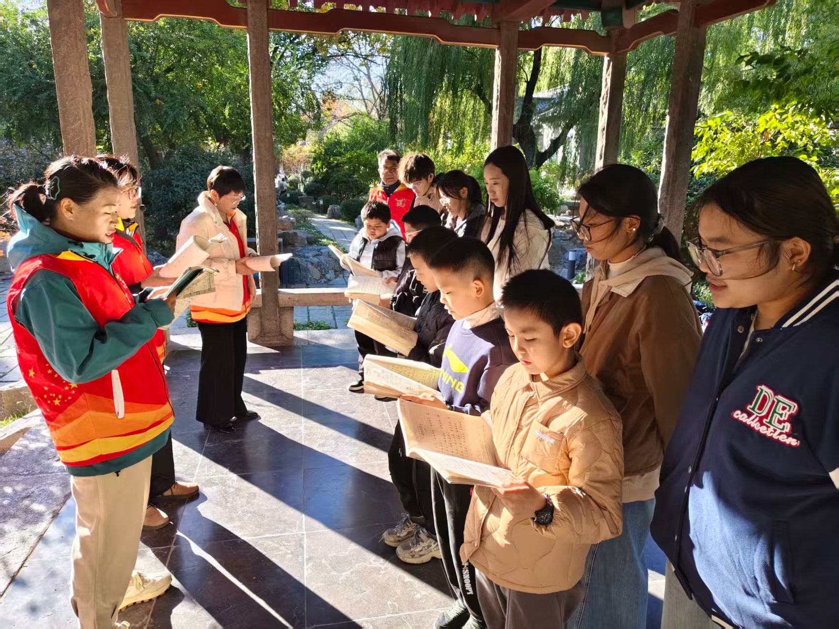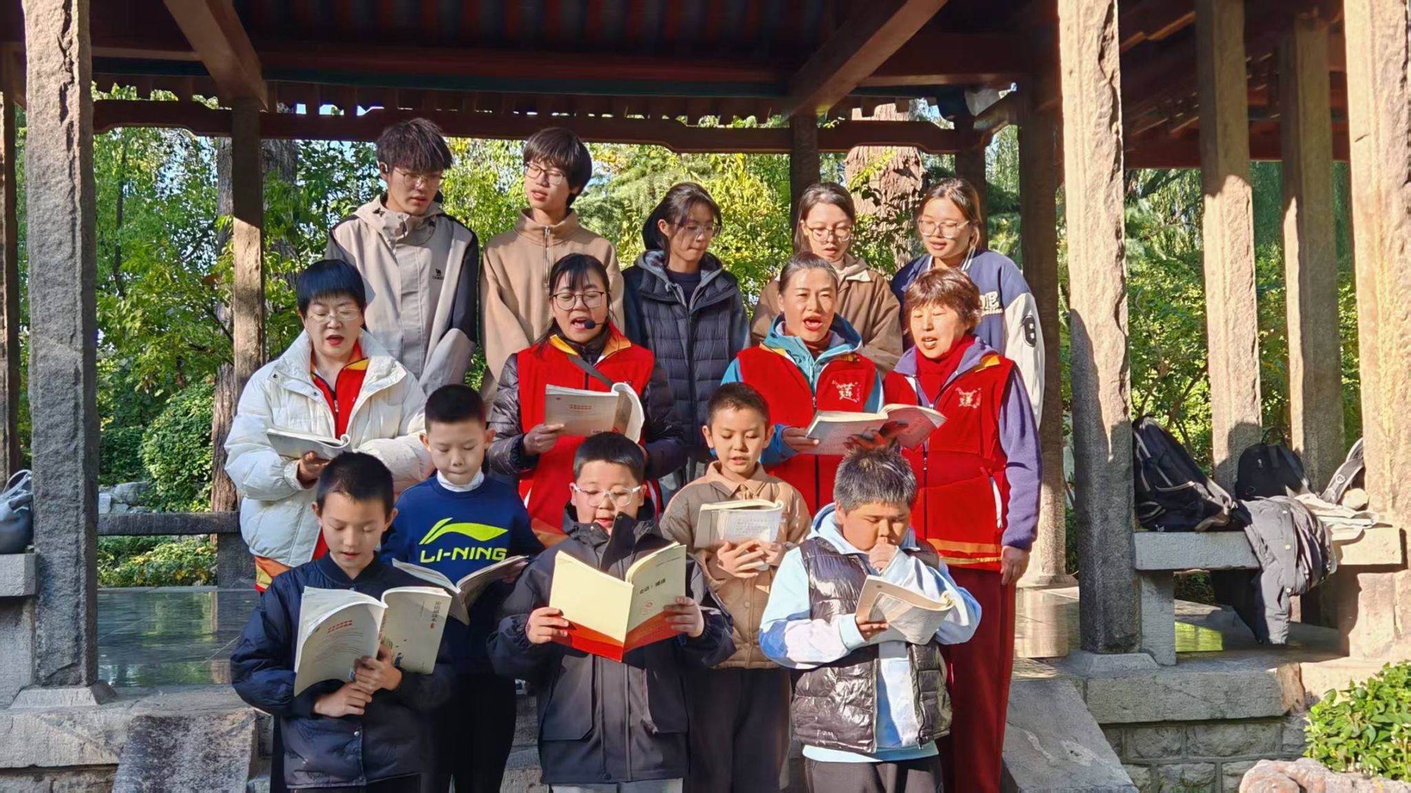 大明湖畔秋风轻拂,暖阳倾泻。老师们带领志愿者与同学们整理衣冠、正身肃立,演示了承载着“自强不息、厚德载物、精忠报国、孝亲敬老”精神内核的古代礼仪。这体现了中华民族重要的精神美德与价值准则,共同构成个人修养与家国情怀的核心追求。揖礼演示环节过后,老师们领诵《论语》中的学而篇和雍也篇,志愿者和同学们跟读,朗朗书声随即回荡全场。抑扬顿挫的声调里,字句间蕴含的处世智慧与道德箴言仿佛穿越千年,与现代心灵隔空对话。印刻在经典遗产的文化密码,并未因时光流逝而褪色,反而在朗声诵读中愈发清晰,成为滋养当下精神世界的重要养分。