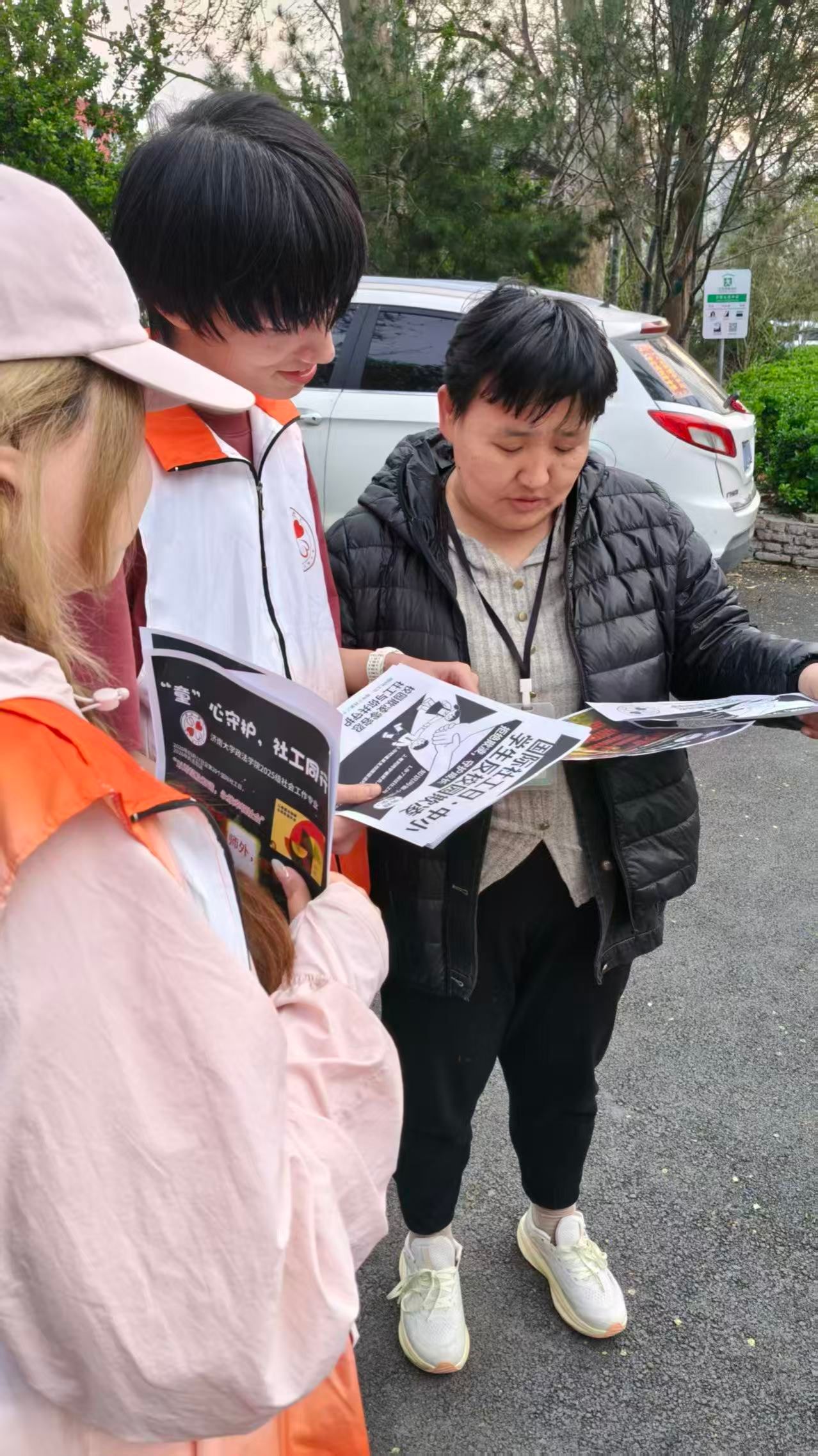 4月2日下午,济南大学社会工作专业2025级本科生在七贤中学门口开展“童心守护,社工同行”国际社工日反校园欺凌主题宣传活动。本次活动在韩钰、范文清两位老师悉心指导下精心筹备,团队提前准备校内宣讲PPT,结合现场实际调整为校外宣传,以传单发放与非结构式访谈相结合的方式,向中学生及家长普及社会工作专业知识,呼吁共同抵制校园欺凌。